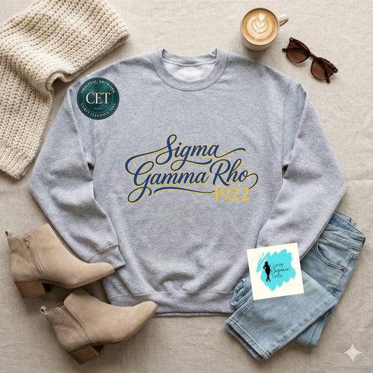 Sigma Gamma Rho 1922 Script Shirt or Sweatshirt – Royal Blue & Gold Sorority Apparel (S–5XL)